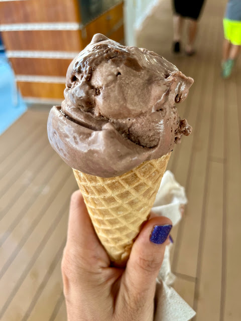 Then it was time for rum punch (for the adults) and banana bread. Their banana bread is particularly yummy and we lounged in the sun to dry off and warm up as the boat carried us back through that beautiful blue water to the dock in St. John, Antigua. We were back onboard around 3:00 and then it was time for another round of showers, laundry, and snacks. After she was cleaned up, Emmaline went off to work on the photo scavenger hunt for the day and Roger and I finished up that second round of laundry we weren’t able to do the day before. I organized some things about the room and made some notes for my trip report. Then, wouldn’t you know it, it was time for ice cream! When I first heard they were opening paid ice cream shops on the Dream and the Fantasy, I thought that was the dumbest thing ever. Why would you pay for ice cream when you can get soft serve for free pretty much anytime? Welp, it’s because it’s really good ice cream and gelato. It’s like buying a fancy coffee from Cove Cafe vs. getting drip coffee from the machine on deck. Major upgrade. Plus, Roger really likes that they have plant-based options.