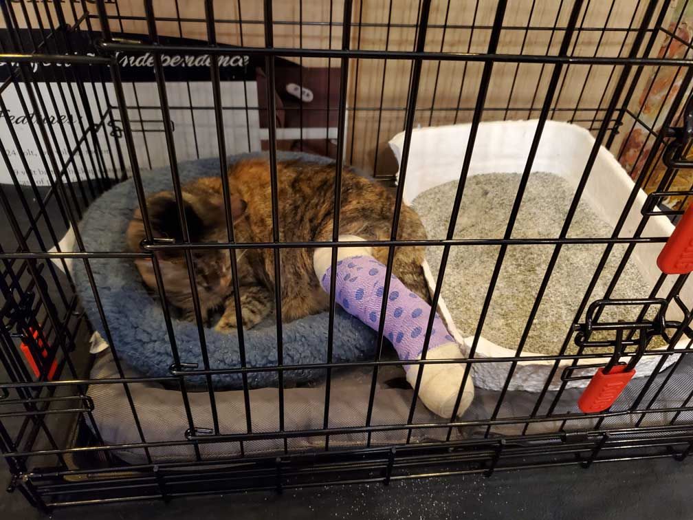 By the time I was done being adjusted, the vet had called Fran. She had a fractured leg. They didn’t have an orthopedic surgeon in house today, but they bandaged up her leg with a splint and would send her home with a recheck in a week. So here has been her life for the past 2+ weeks.