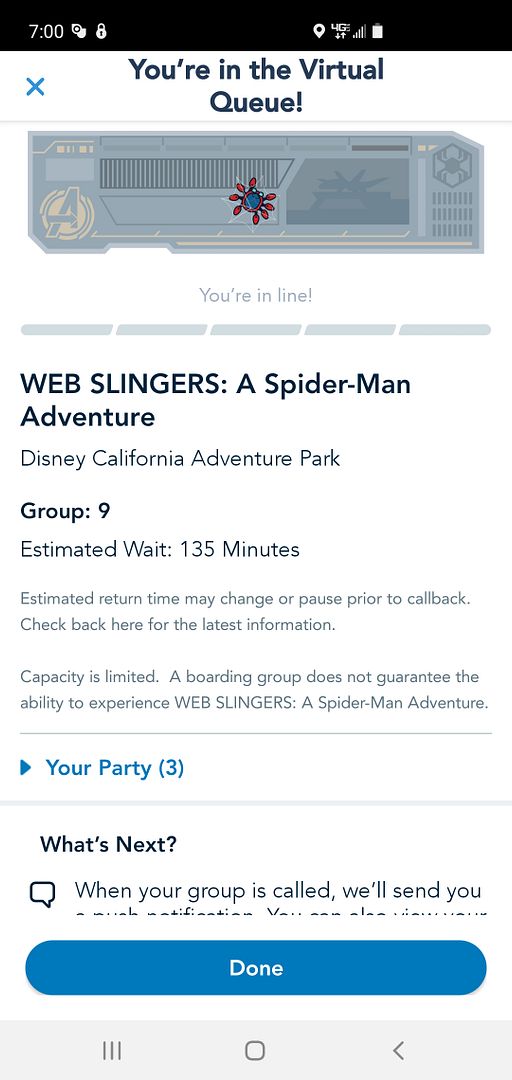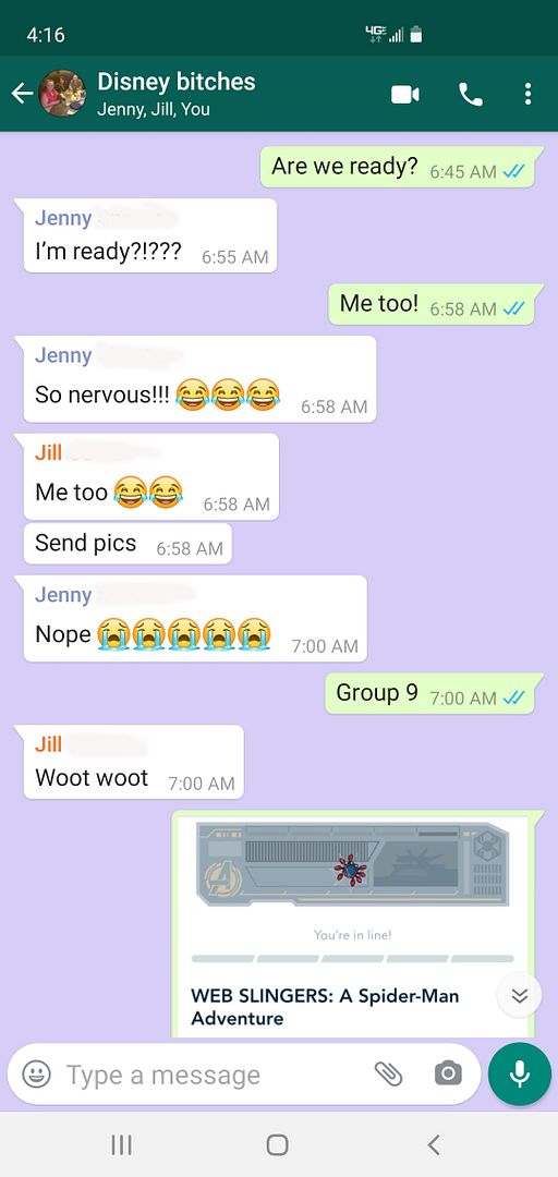 She had been trying for a BG for weeks since the ride opened with no success. She works from home assessing mentally unstable patients who need psychiatric care. She described her obsession with getting the BG like this. "I feel so bad for the clients, but I NEED this. I feel like I'm saying, 'I know you're suicidal, but can you just give me 5 minutes while I try for this Webslingers Boarding Group? Then I’m all yours!' Crazy huh?"
