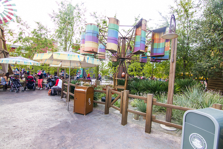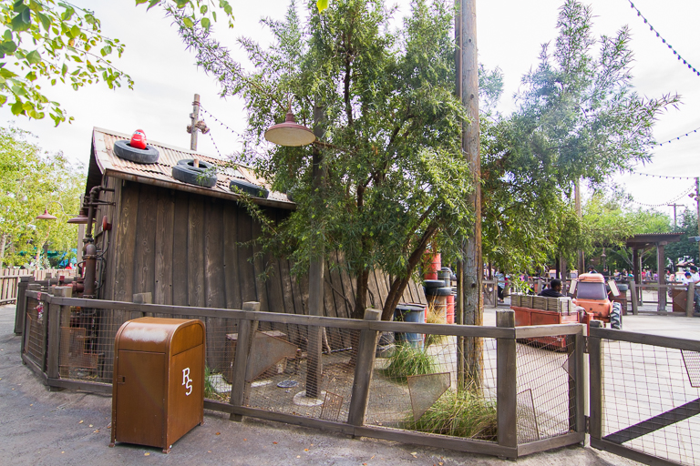 And here's the reason I missed the wide angle shot. Looking back towards Mater's, I see Lightning McQueen hanging out on the roof of that shed. I was so excited to find him, I completely forgot to take the other shot. I don't know that you'd even be able to see Lightning from the entrance to Mater's Junkyard Jamboree. He's much easier to see from the Bugs Land side.