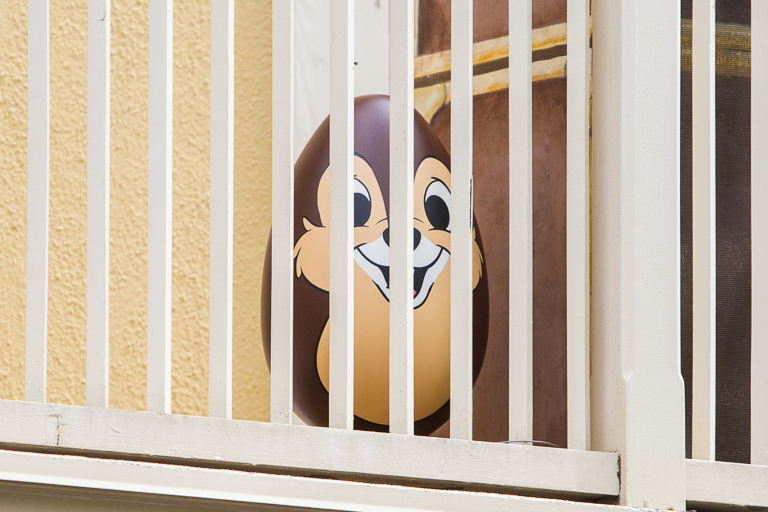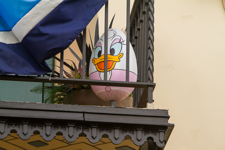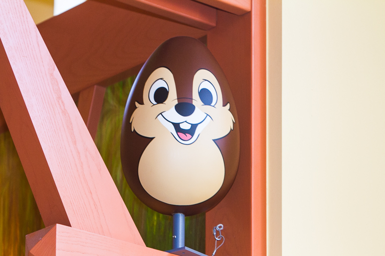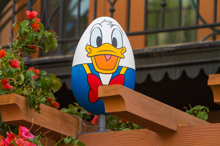 Hanging out over the Disney Vacation Club is Donald. In this one little area, Theresa was able to stand in one spot and see 4 eggs simultaneously. Do a better job hiding them!
