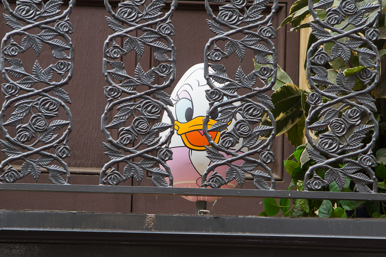 Back towards the entrance through New Orleans Square, sitting above the balcony of Mlle. Antoinette's Parfumerie is Daisy.