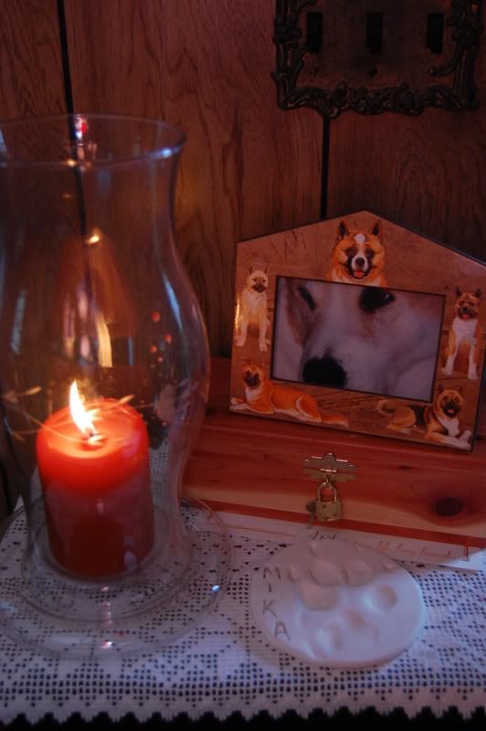 I just saw your Mika pictures. The last ones with the box of her ashes, her photo right there, the dim lighting...beautiful. Your Mika is always with you.