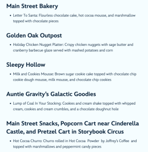 Satisfy your sweet tooth with holiday treats offered throughout the park. Cookies and cocoa are available to Guests at designated locations for no additional charge. There's apple cider at some locations.