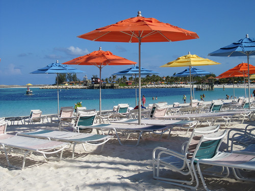 Here is a pic of the CC Family beach area. You can see there are plenty of chairs and umbrellas for all who want them. You may have move down the beach to get one if you are slow off the ship but you will have no trouble getting one. Have a Magical cruise.