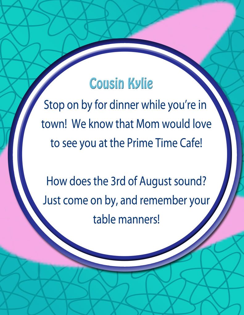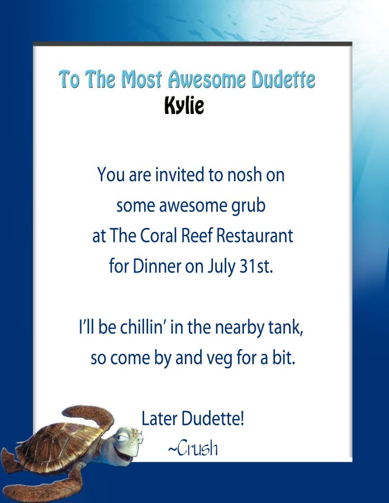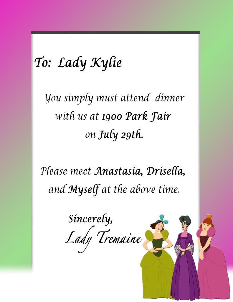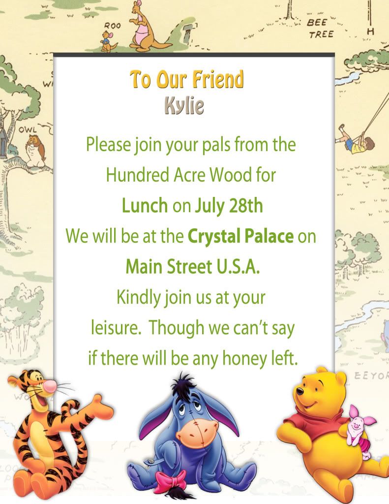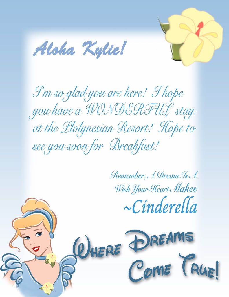 I love your invitations! Could you do one for CRT, 1900 PF, Chef Mickeys, Coral Reef, Crystal Palace, PSB, GF Tea party, and BBB for Kylie?:cloud9: Thanks! Also can you do a welcome letter to poly for Kylie from Cinderella?? TIA!:banana: