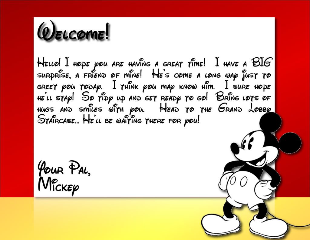 Welcome! Hello! I hope you are having a great time! I have a big surprise, a friend of mine! He's come a long way just to greet you today. I think you may know him. I sure hope he'll stay! So tidy up and get ready to go! Bring lots of hugs and smiles with you. Head to the Grand Lobby Staircase... He'll be waiting for you!