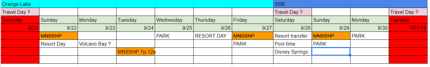 We will be arriving to offsite resort Orange Lake on 9/21, then switching to SSR on 9/28 and flying home on 10/1. We have 6 people in our party. 3 of us have the 4 day magic tickets. and we want to do a MNSSHP. The 4 day tickets have to be used within 7 days. so trying to decide on our 1st park day. We do not want to do a park day on the MNSSHP night. Here is a snipped image of my initial thoughts. What do you think ?