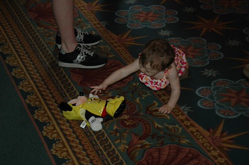 We both get dressed and head to my mom’s room. She had bought me the mickey/Minnie wedding plushes, too cute!! I put them in my wheely suitcase and we all head to the lobby.