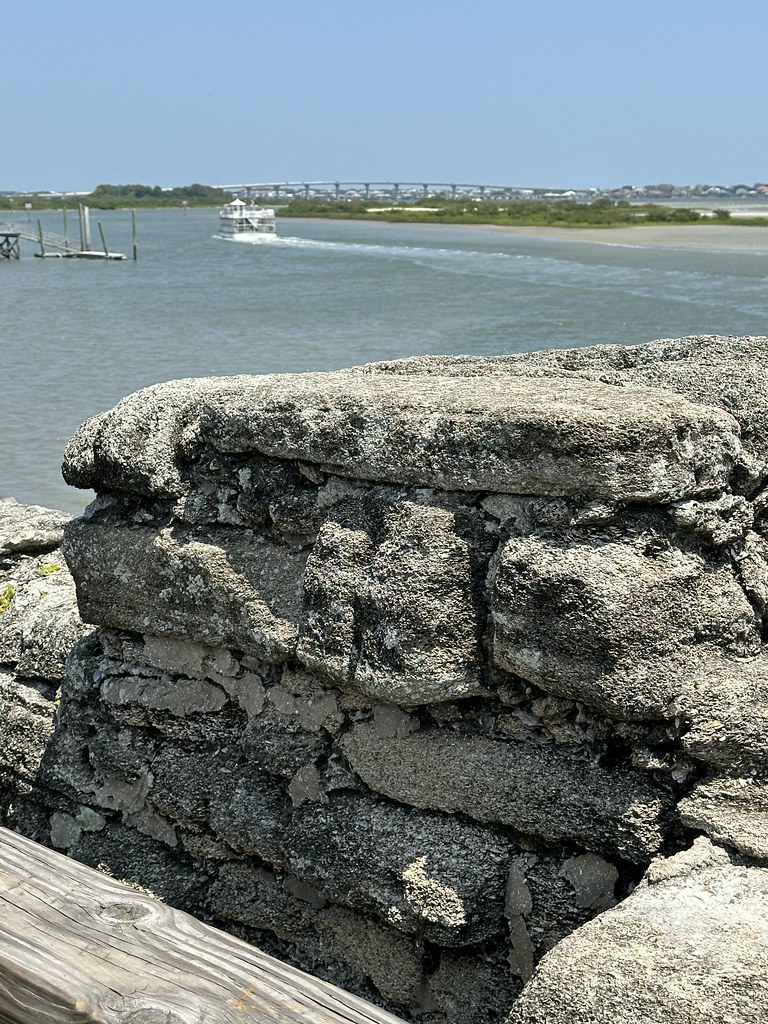 Looking in the opposite direction, I saw Victory III treading further along the river and in the background, I spotted the Francis and Mary Usina Bridge, connecting Saint Augustine with another barrier island home to Vilano Beach. In the foreground of the photo, I even got a closer look at some of the coquina used to build the fort. As I learned earlier from Villa Zorayda's historical plaque earlier, coquina was the main building material used until the late 1800s, when Franklin W. Smith invented coquina shell reinforced concrete, which was the main building material going forward. Prior to this point, coquina stones, like those used for the Castillo de San Marcos, were the predominant building material.